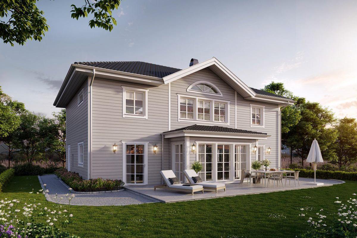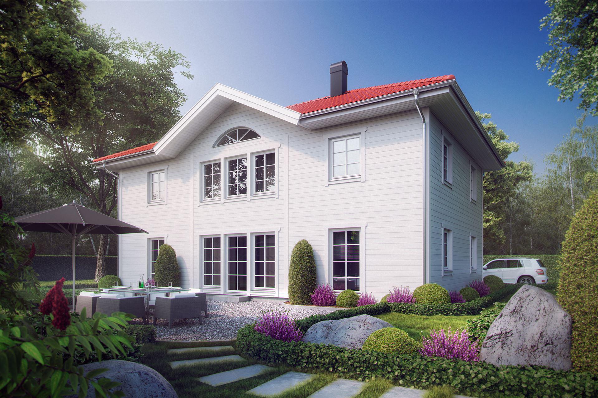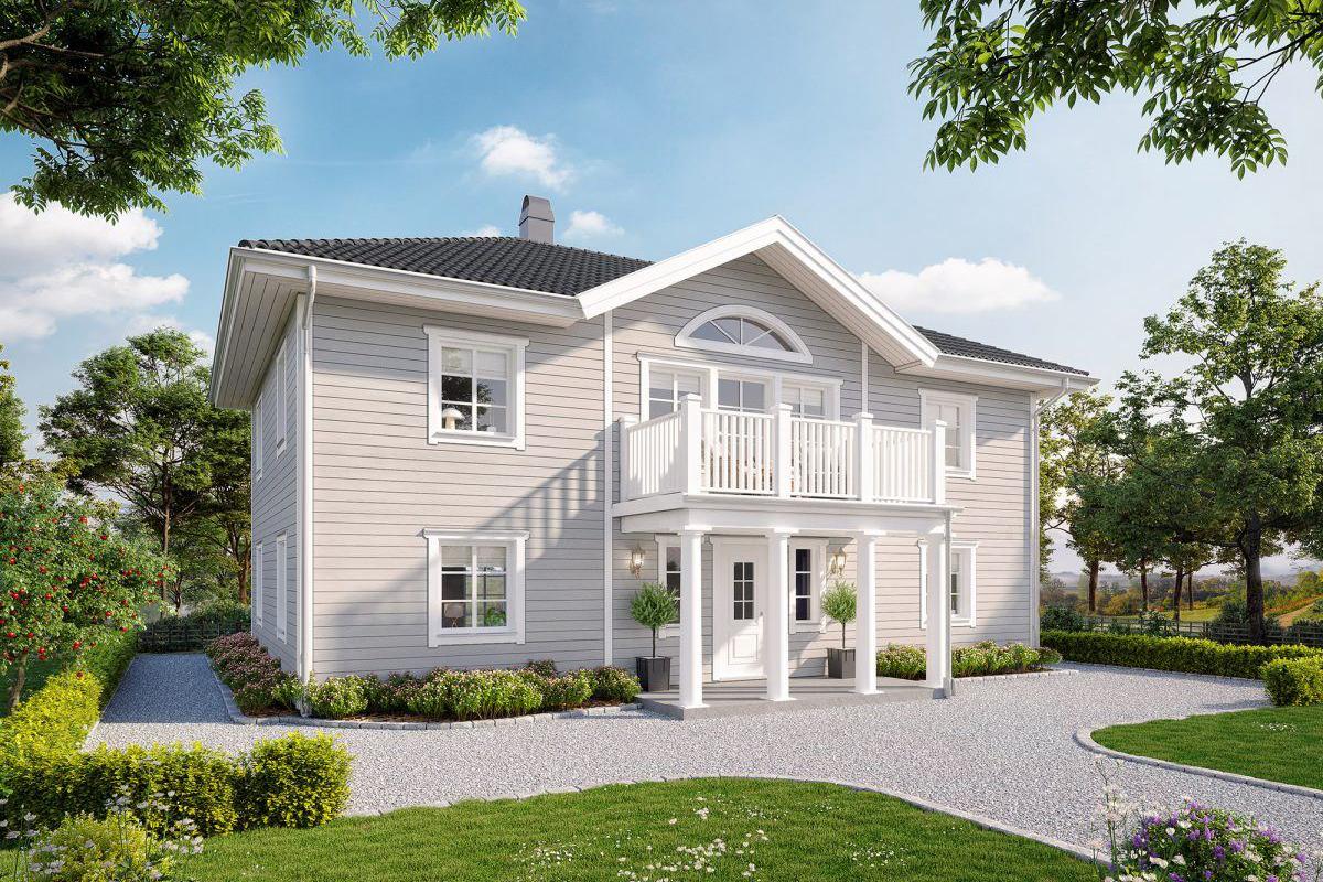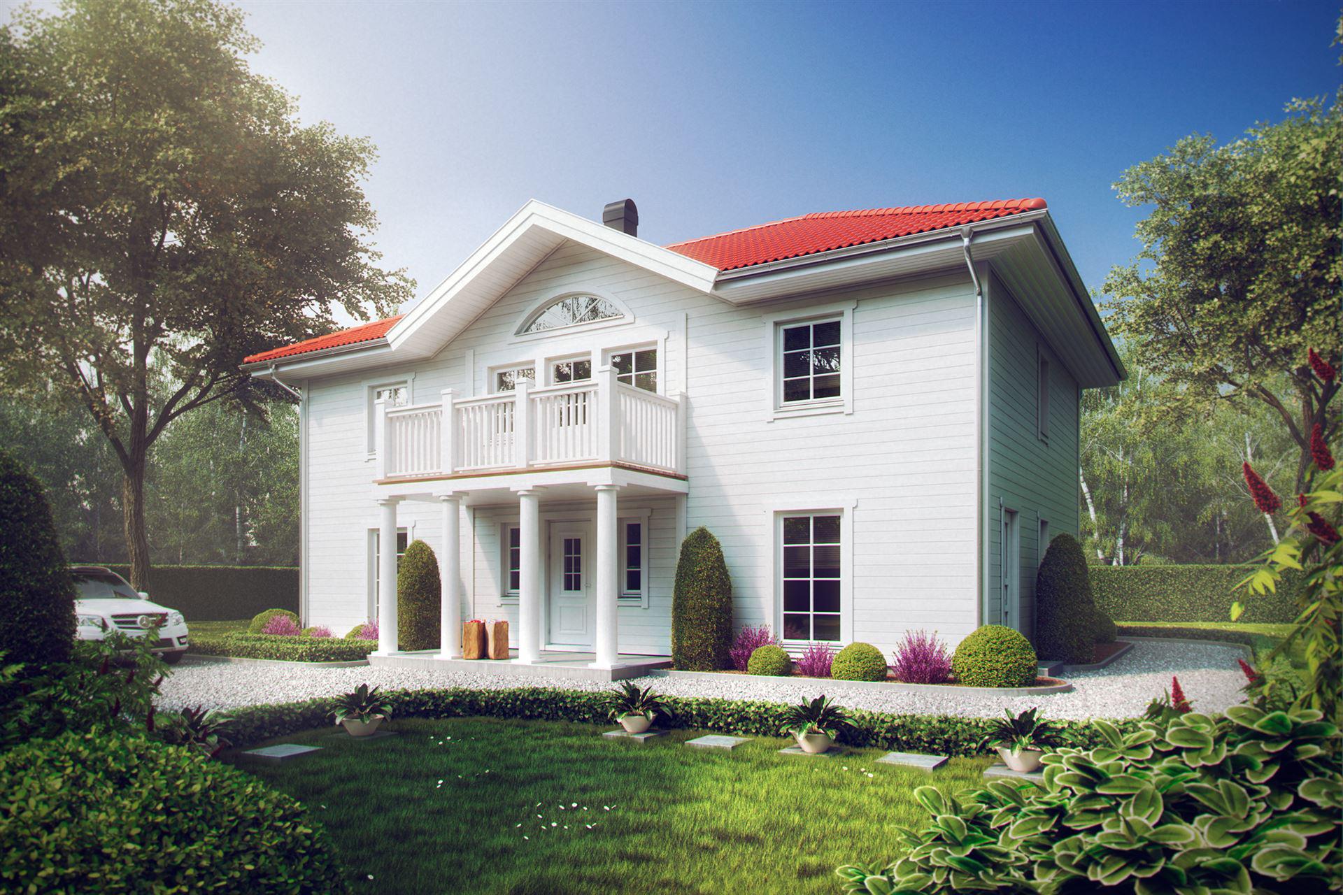 Der harmonische Gesamteindruck dieser stattlichen Villa wird maßgeblich durch die symmetrisch angeordneten Fenster bestimmt. Ein weißer Balkon und weiße Fenstereinfassungen bilden einen schönen Kontrast. Die klassische Linienführung setzt sich auch im Inneren des Hauses bei der Grundrissgestaltung fort. Der Eingangsbereich mit seinen Säulen unterstreicht den Anspruch, eine Villa, für den anspruchsvollen Bauherren, zu sein. Das in zweigeschossiger Bauweise erstellte Gebäude kann mit unterschiedlichen Materialien für die Fassadengestaltung beeindrucken. Die hier gezeigte Holzfassade ist klassisch -schwedisch-.