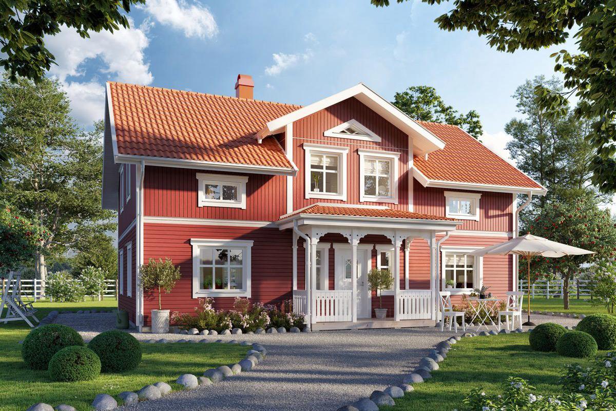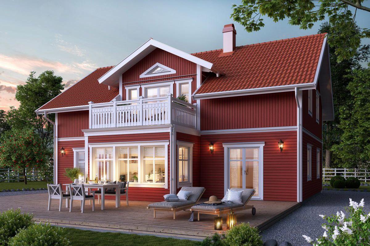 Ein Landhaus, in einem Baustil, dessen Wurzeln im zweiten Teil des 18. Jahrhunderts zu finden sind. Um die Jahrhundertwende waren diese Häuser mit ihrer waagerechten, gefasten Spundschalung charakteristisch für diese Zeit. Die ansprechend eingefassten Fenster und die Spiegeltüren drücken auch heute noch die Freude am Tischlerhandwerk aus. In Schweden