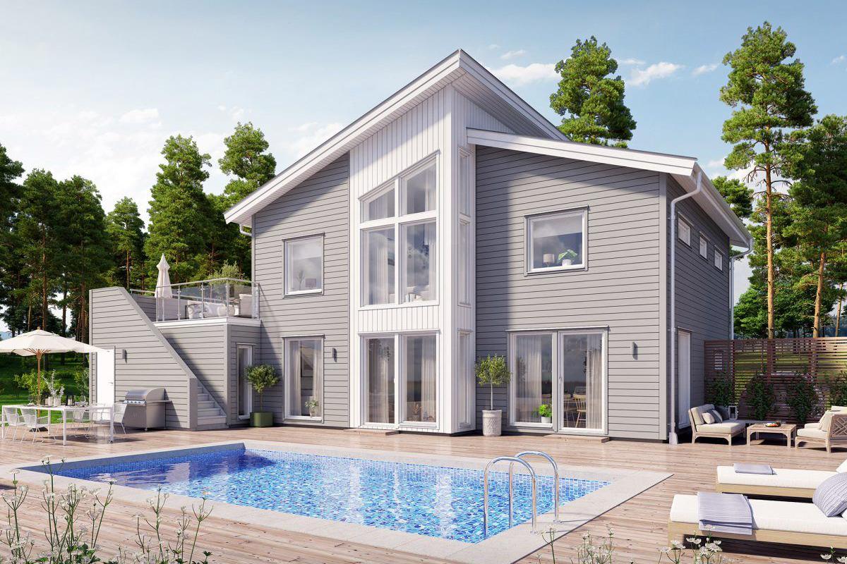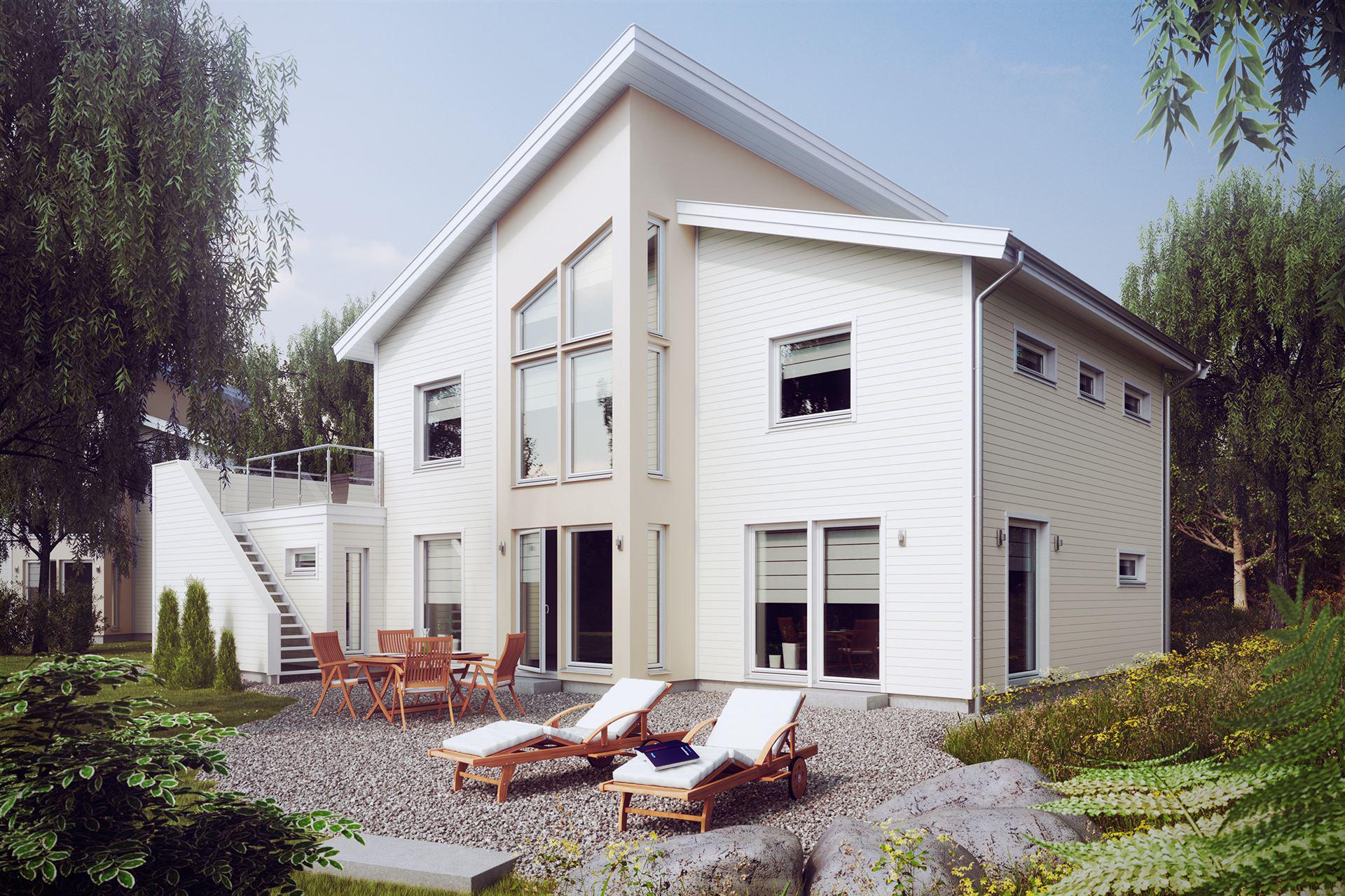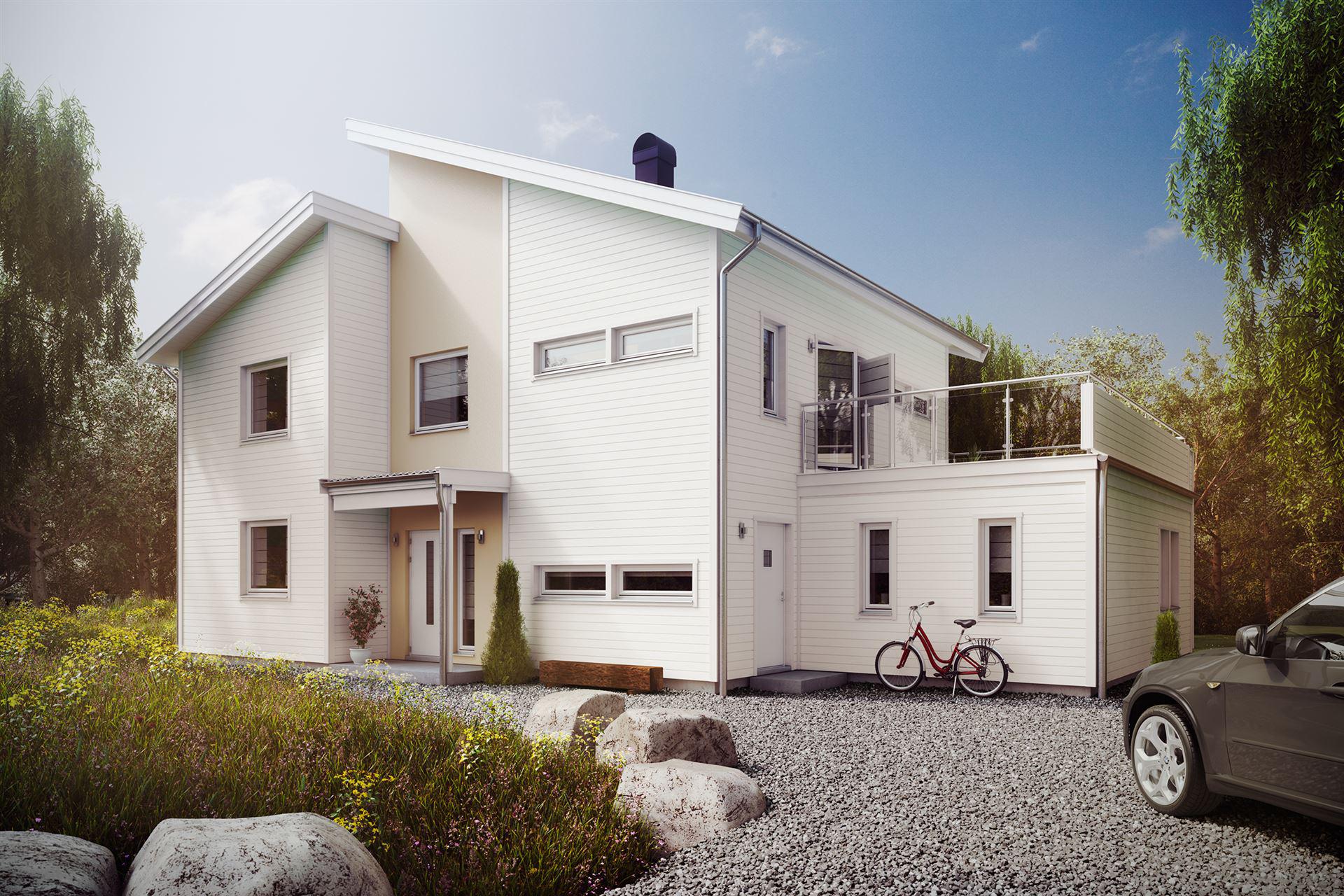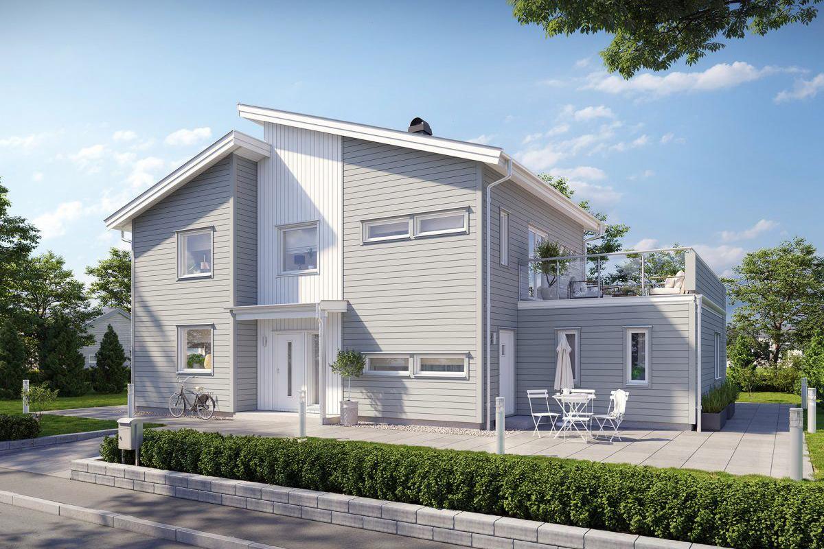 Ein unkonventionelles Gebäude im Stil der in Schweden so beliebten Funkis Häuser. Die gegeneinander versetzten, auch in ihrer Höhe unterschiedlichen Baukörper unterstreichen den Anspruch des Besonderen dieser Stilrichtung. Das erste Gebäude im Funkis-Stil wurde in Stockholm von Nils Einar Eriksson (1899-1978) erbaut. Vergleichbar ist dieser Bau-Stil mit dem deutschen Bauhaus-Stil.
