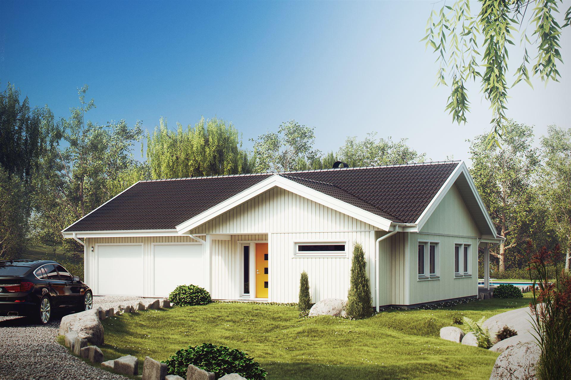 Almenäs ist ein elegantes und stilvolles Haus, das sich sehr gut für kleinere Grundstücke eignet. Die integrierte Garage bietet ausreichend Platz für zwei Autos und darüber hinaus Stellfläche für Fahrräder und Gartengeräte. Direkt vor der Längsseite des Bungalows lässt sich hervorragend eine Terrasse, im Windschatten der Garage, platzieren. Die zweite Terrasse ist überdacht und direkt vom Wohnbereich über die bodentiefen Fensterelemente zu erreichen.