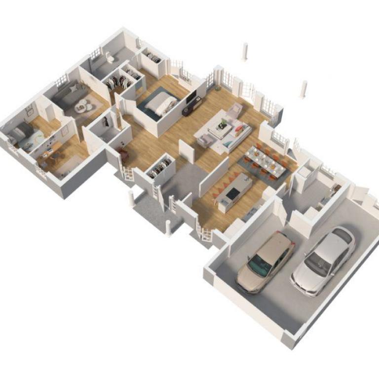 Die einladende Diele, mit integrierter Garderobe, nimmt den Besucher sofort für sich ein. Die Küche, nach schwedischem Vorbild offen geplant, lässt das geräumige Wohnzimmer mit seiner imposanten Kathedraldecke noch größer erscheinen als es ohnehin schon ist. Ein Entwurf der auch bei Luxus gewöhnten Menschen keinen Wunsch offen lässt.