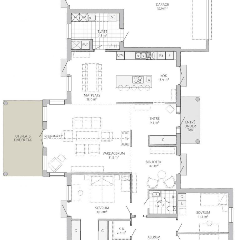 Söderhill ist eine echte Attraktion und richtet sich an Liebhaber des Wohnens auf einer Ebene. Die bodentiefen Fenster korrespondieren perfekt mit dem extravaganten Eingangsbereich. Auf der Rückseite des Bungalows lädt eine weit überdachte Veranda zum Verweilen ein.