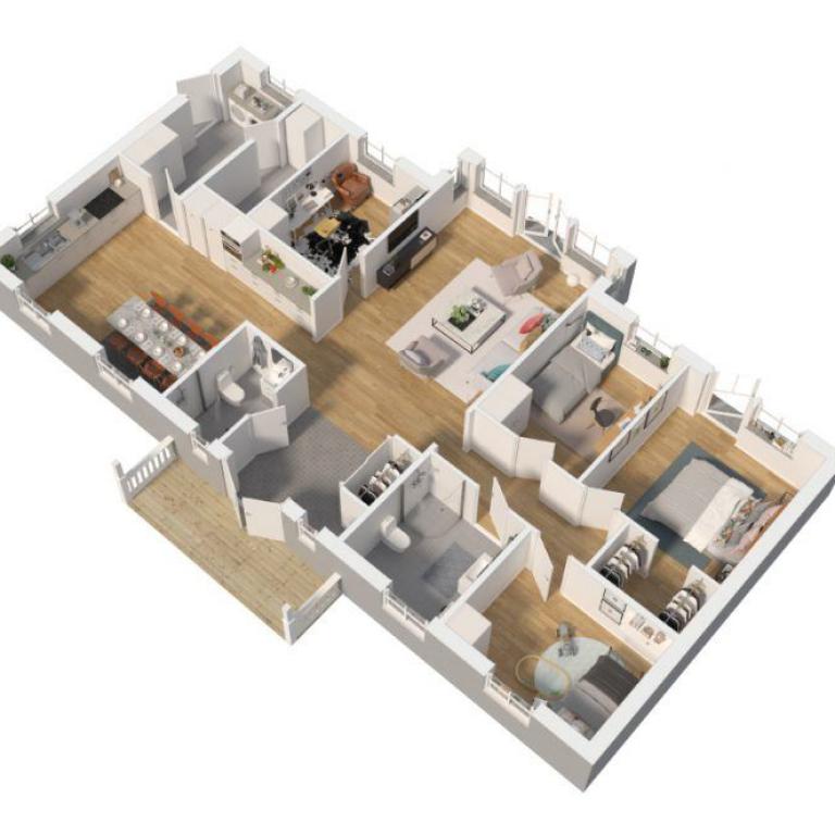 Der Grundriss des Eingangsbereiches, besticht durch seine Helligkeit, praktischen Aufbewahrungsmöglichkeiten sowie eine leicht erreichbare Ankleide. Durch die gut durchdachte Aufteilung der Räume ergibt sich die Möglichkeit für zwei Schlafzimmer plus ein zusätzliches Arbeitszimmer im rechten Teil des Hauses. Auf Grund der durchgehenden Kathedraldecke bildet der Eingangsbereich zusammen mit dem Wohnzimmer eine große und offene Atmosphäre. Im linken Teil des Hauses befinden sich die großzügige Küche , ein weiteres Schlafzimmer und eine Waschküche die durch einen Nebeneingang ebenso erreichbar sind.