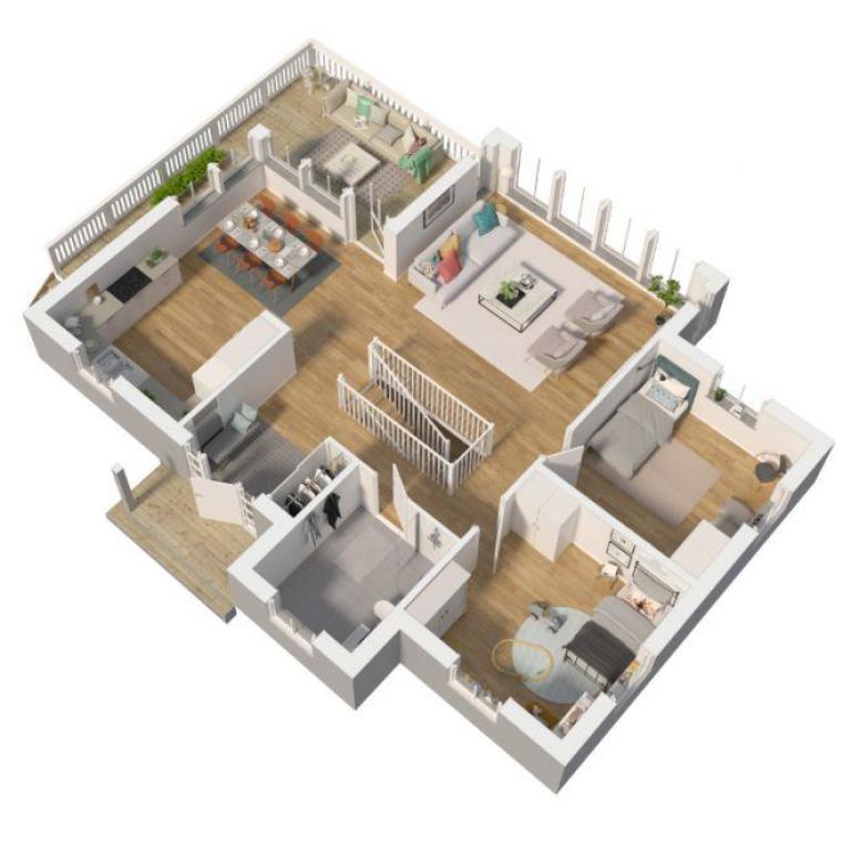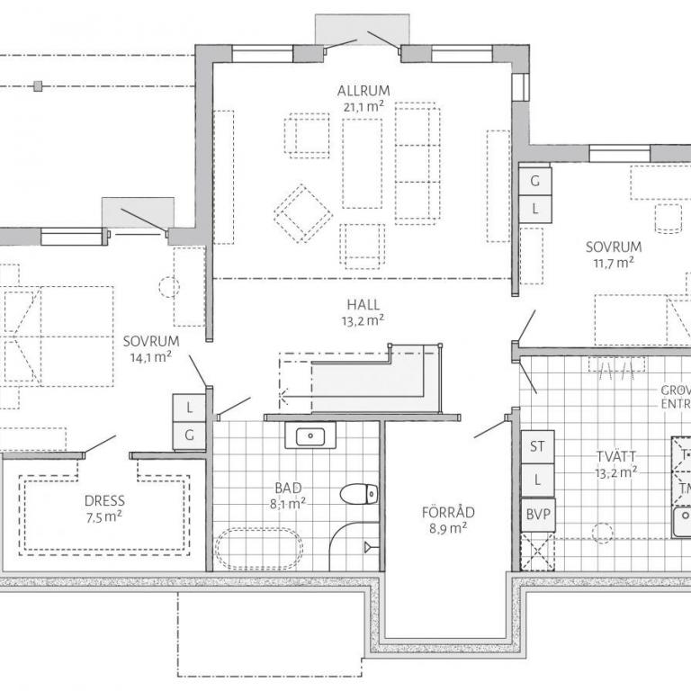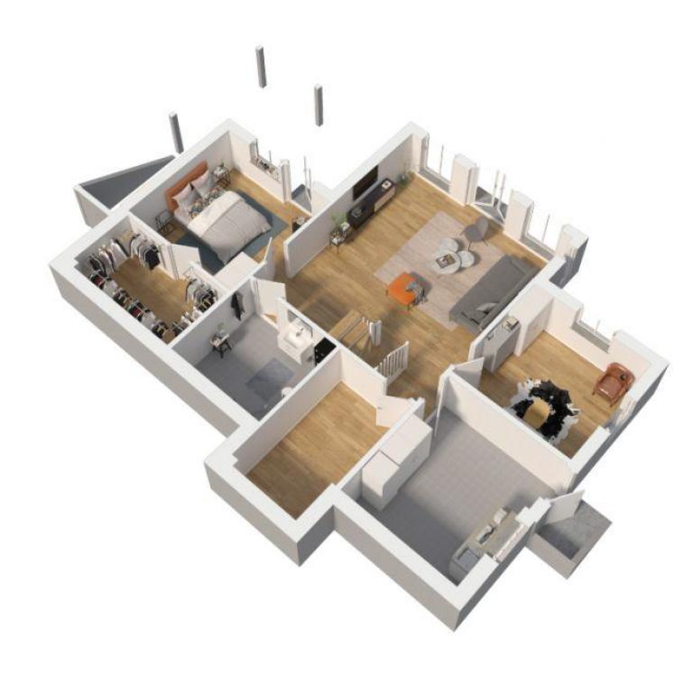 Sundvik ist ein besonders gut gelungenes Haus für die Hanglage. Das Wechselspiel von Holzpanelen und Putz wirkt interessant und lenkt den Blick auf die beiden großen Balkone. Die üppigen Fensterflächen und die Kathedraldecke des Wohnzimmers zeigen dem Betrachter bereits auf dem ersten Blick, dass es sich hier um ein Haus der Sonderklasse handelt. Der Hauseingang kann, ohne größere Veränderungen des Hauses, auf der Hangseite gebaut werden. Aufmerksamkeit verdient die detaillierte Grundrissplanung im Inneren des Hauses.
