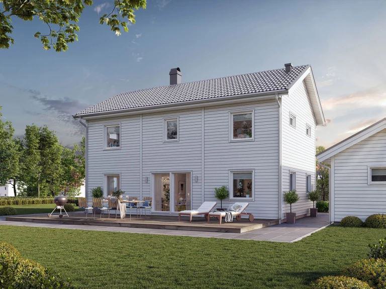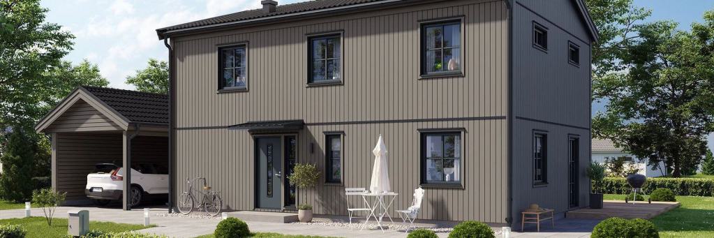 Ein stilvolles Äußeres verleiht dem Prio 145 Modern einen eleganten und einladenden Ausdruck, der in allen Umgebungen funktioniert. Prio 145 ist ein zweistöckiges Haus, das sich mit der Familie verändern kann. Wenn die Kinder ausziehen, können Sie die Schlafzimmer im Obergeschoss ganz einfach in begehbare Kleiderschränke oder Arbeitszimmer verwandeln. Die Treppe, die sich in der Mitte des Hauses befindet, verbirgt viel Platz zum Verstauen der Oberbekleidung der Kinder. Oder das Golfsets.