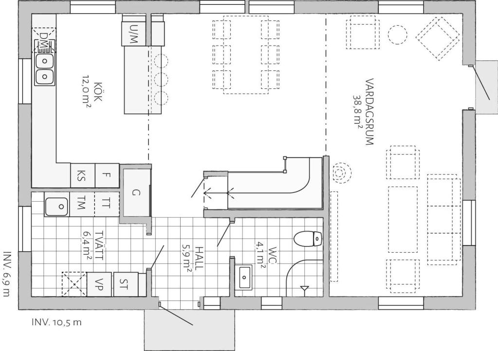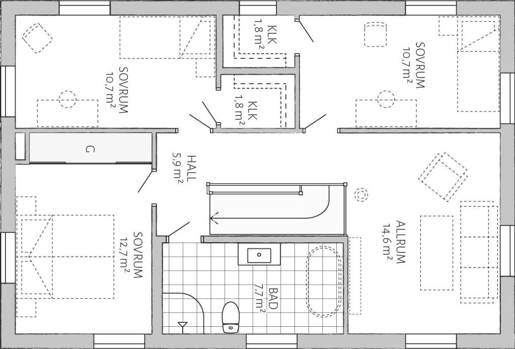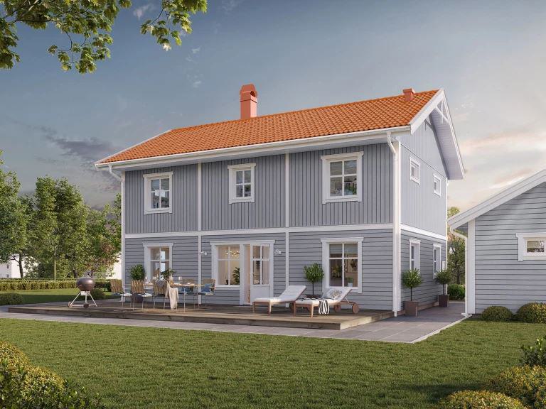Mit weißen Ästen und einer wunderschönen Veranda als krönenden Abschluss spiegelt der Prio 145 Traditionell Sicherheit und schwedisches architektonisches Erbe wider. Prio 145 ist ein zweistöckiges Haus, das sich mit der Familie verändern kann. Wenn die Kinder ausziehen, können Sie die Schlafzimmer im Obergeschoss ganz einfach in begehbare Kleiderschränke oder Arbeitszimmer verwandeln. Die Treppe, die sich in der Mitte des Hauses befindet, verbirgt viel Platz zum Verstauen der Oberbekleidung der Kinder. Oder das Golfsets.
