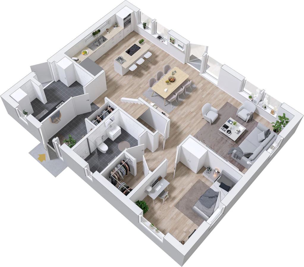 Mit minimalistischen Details erinnert der Prio 165 Industrial an luftige Scheunen und Künstlerateliers. Im 1,5-stöckigen Haus Prio 165 gibt es viel Licht und Platz. Vom offenen Grundriss zwischen Küche und Wohnzimmer bis hin zu den 3 großzügigen Schlafzimmern im Obergeschoss. Für noch mehr Lichteinfall in Küche und Wohnzimmer wählen Sie bodenhohe Fenster und Türen nach hinten.