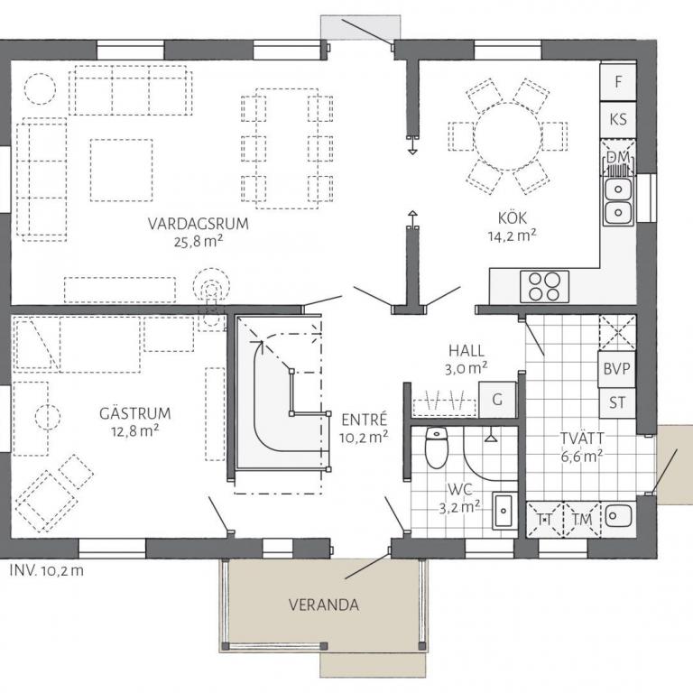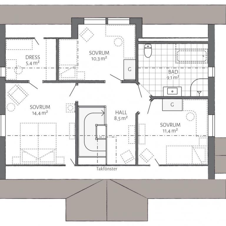 Charakteristisch für dieses große, exklusive Haus ist die mittig konstruierte Gaube. Die Frontveranda ist nicht nur ein außerordentlicher Blickfang, sondern zudem eine Sitzgelegenheit im Freien. Ein originelles Landhaus im schwedischen Stil, das sich mit seinen Abmessungen von 10,85 m x 8,42 m Außenmaß hervorragend für kleine Grundstücke eignet.