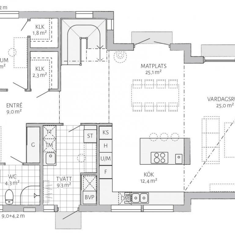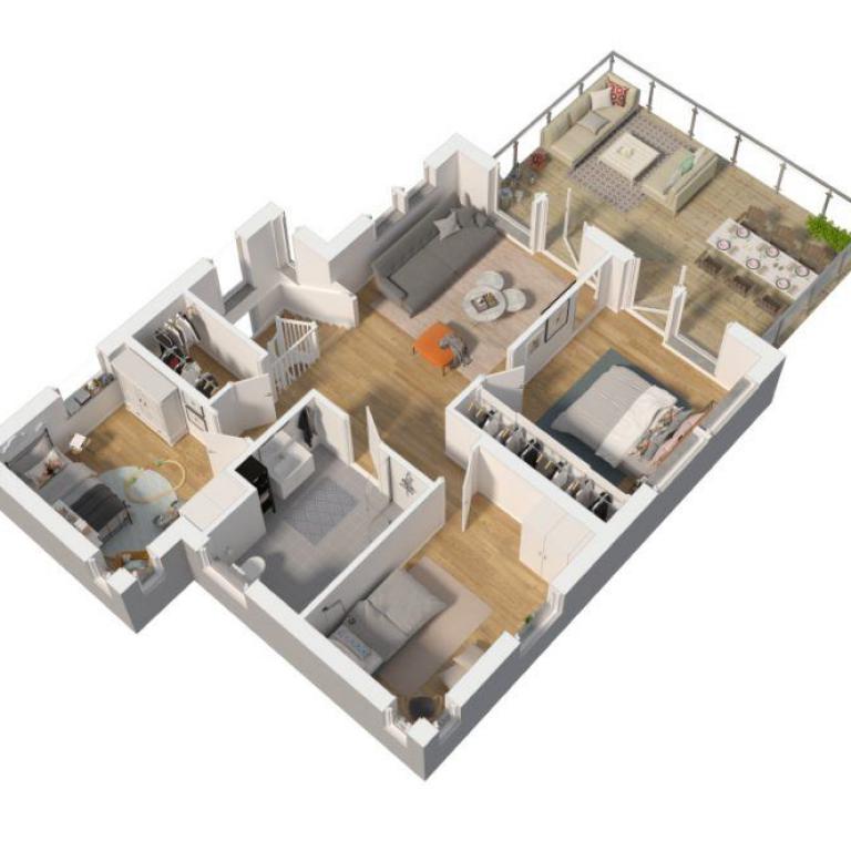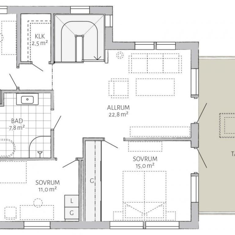 Vom Gemeinschaftsraum, den in Schweden üblichen „Allrum“, gelangt man in die drei Schlafräume und dem Badezimmer. Das Platzangebot auf dieser Ebene passt zu der Vorstellung die sich der Betrachter, dieser gut durchdachten Planung, macht. Auf kleineren Grundstücken kann die große Terrasse fehlende Grundstücksgröße spielend ausgleichen.