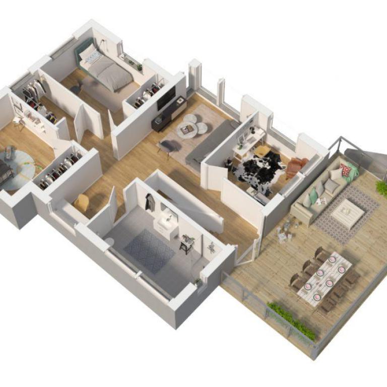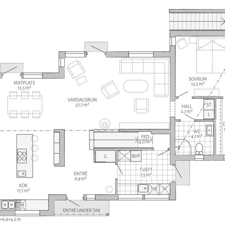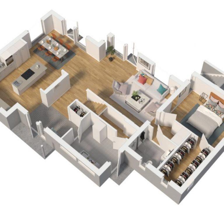 Die weitgehend offene Fläche wird durch das Spiel des Lichtes geprägt, das über die bodentiefen Fensterelemente in den Raum gelangt. Eine große Diele verbindet die Küche, das Wohn-, Esszimmer und den Hauswirtschaftsraum miteinander. Das abgelegene Elternschlafzimmer sorgt für erholsamen Schlaf und verfügt über ein eigenes Badezimmer sowie eine Ankleide. Ein zusätzliches Gäste-WC lässt sich problemlos planen.