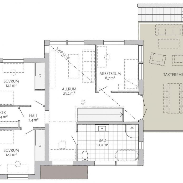 Ein unkonventionelles Gebäude im Stil der in Schweden so beliebten Funkis Häuser. Die gegeneinander versetzten, auch in ihrer Höhe unterschiedlichen Baukörper unterstreichen den Anspruch des Besonderen dieser Stilrichtung. Das erste Gebäude im Funkis-Stil wurde in Stockholm von Nils Einar Eriksson (1899-1978) erbaut. Vergleichbar ist dieser Bau-Stil mit dem deutschen Bauhaus-Stil.