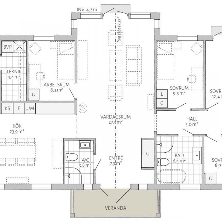 Tallåsen ist ein typisch schwedisches Familienhaus. Die Bauweise entspricht sowohl der klassischen als auch der modernen Bautradition und ist unser meist verkaufter Bungalow. Durch die Mitte des Hauses verläuft eine Kathedraldecke, die zweifellos ein Highlight des Hauses ist. In den Wohnraum wird ungewöhnlich viel Licht gespült , so entsteht eine besondere Atmosphäre, die man selbst einmal erlebt haben muss.