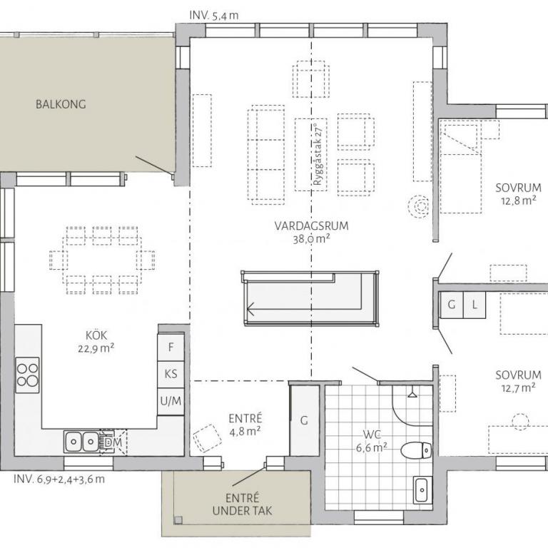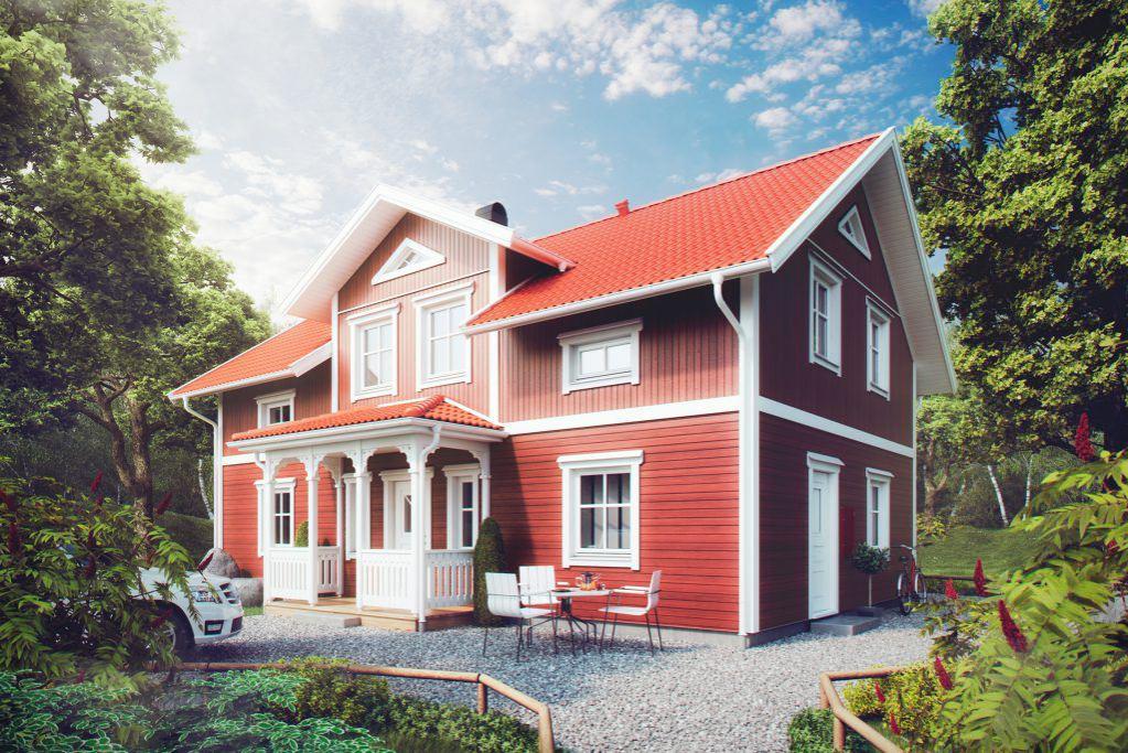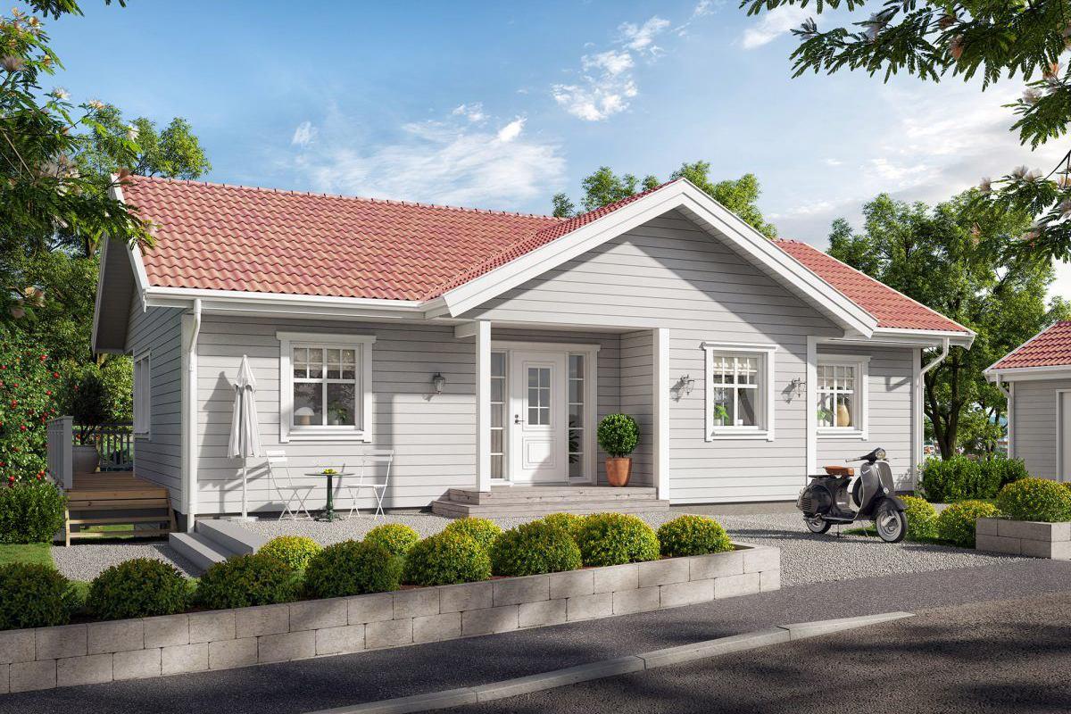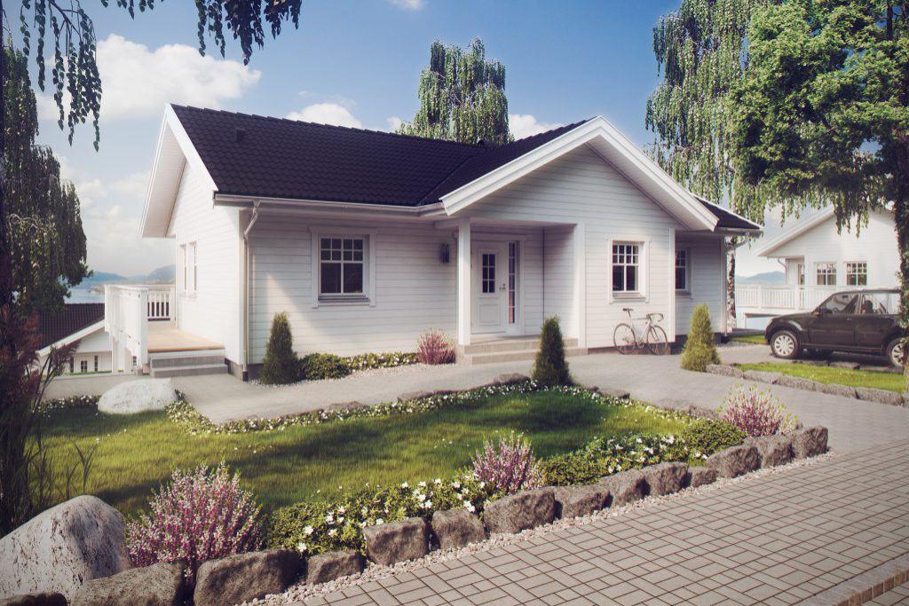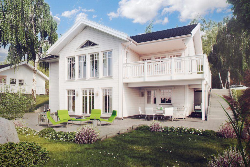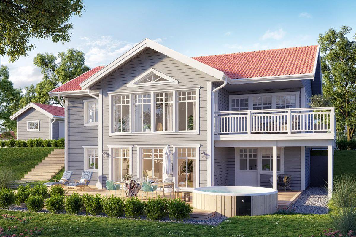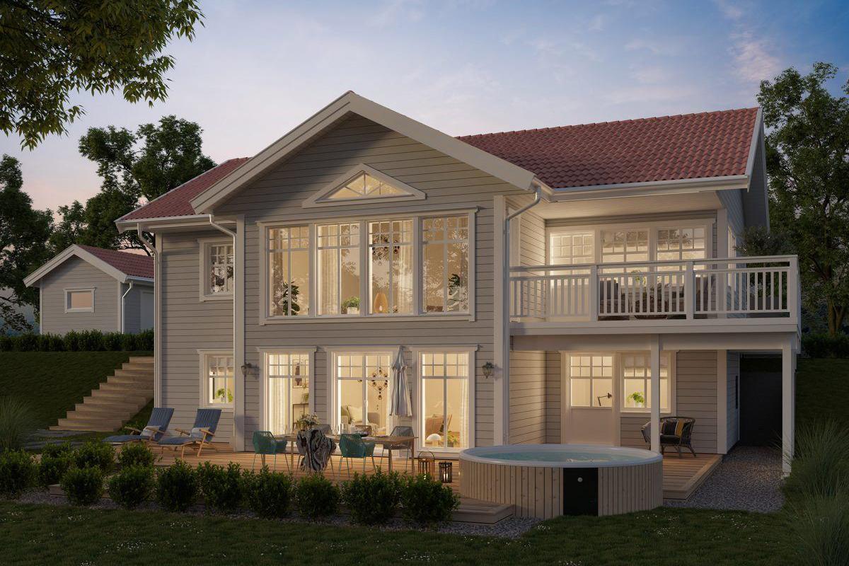 Sundvik ist ein besonders gut gelungenes Haus für die Hanglage. Das Wechselspiel von Holzpanelen und Putz wirkt interessant und lenkt den Blick auf die beiden großen Balkone. Die üppigen Fensterflächen und die Kathedraldecke des Wohnzimmers zeigen dem Betrachter bereits auf dem ersten Blick, dass es sich hier um ein Haus der Sonderklasse handelt. Der Hauseingang kann, ohne größere Veränderungen des Hauses, auf der Hangseite gebaut werden. Aufmerksamkeit verdient die detaillierte Grundrissplanung im Inneren des Hauses.